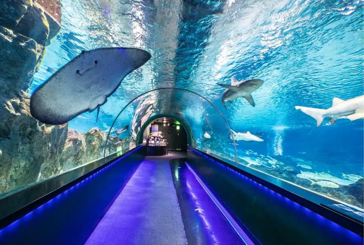 Your journey beneath the ocean begins through a massive glass tunnel where you can “swim” alongside sand sharks, stingrays, and countless exotic fish species. The stunning underwater view creates the illusion of being completely immersed in the sea. This zone is often considered the highlight of the aquarium and one of the most photogenic spots for visitors.