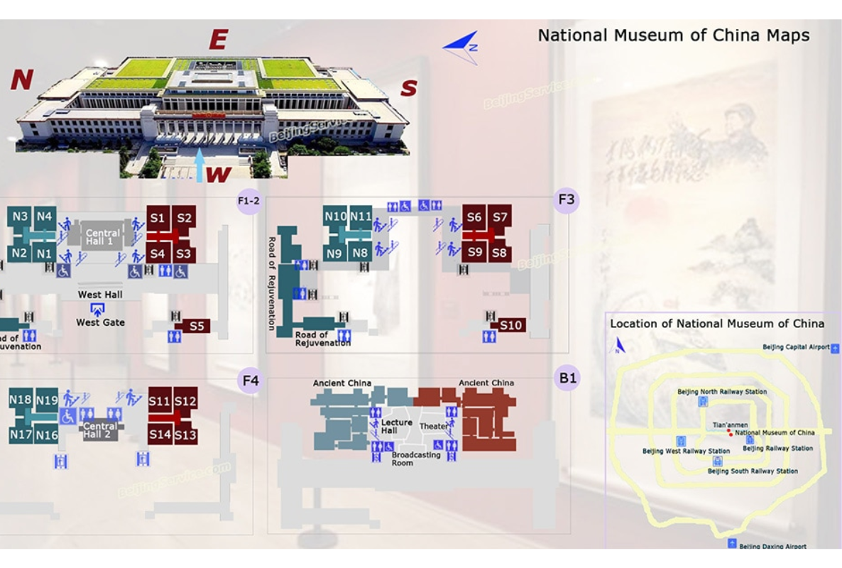 The map of the National Museum of China offers three distinct perspectives to help visitors orient themselves. At the lower right, you can see where the museum is positioned within the broader city map of Beijing. The top left section highlights the entire museum building’s layout, making it easy to distinguish main entrances and the architectural structure. Finally, the bottom left details the internal floor plan, showing how galleries and public spaces are arranged across levels B1 through F4.