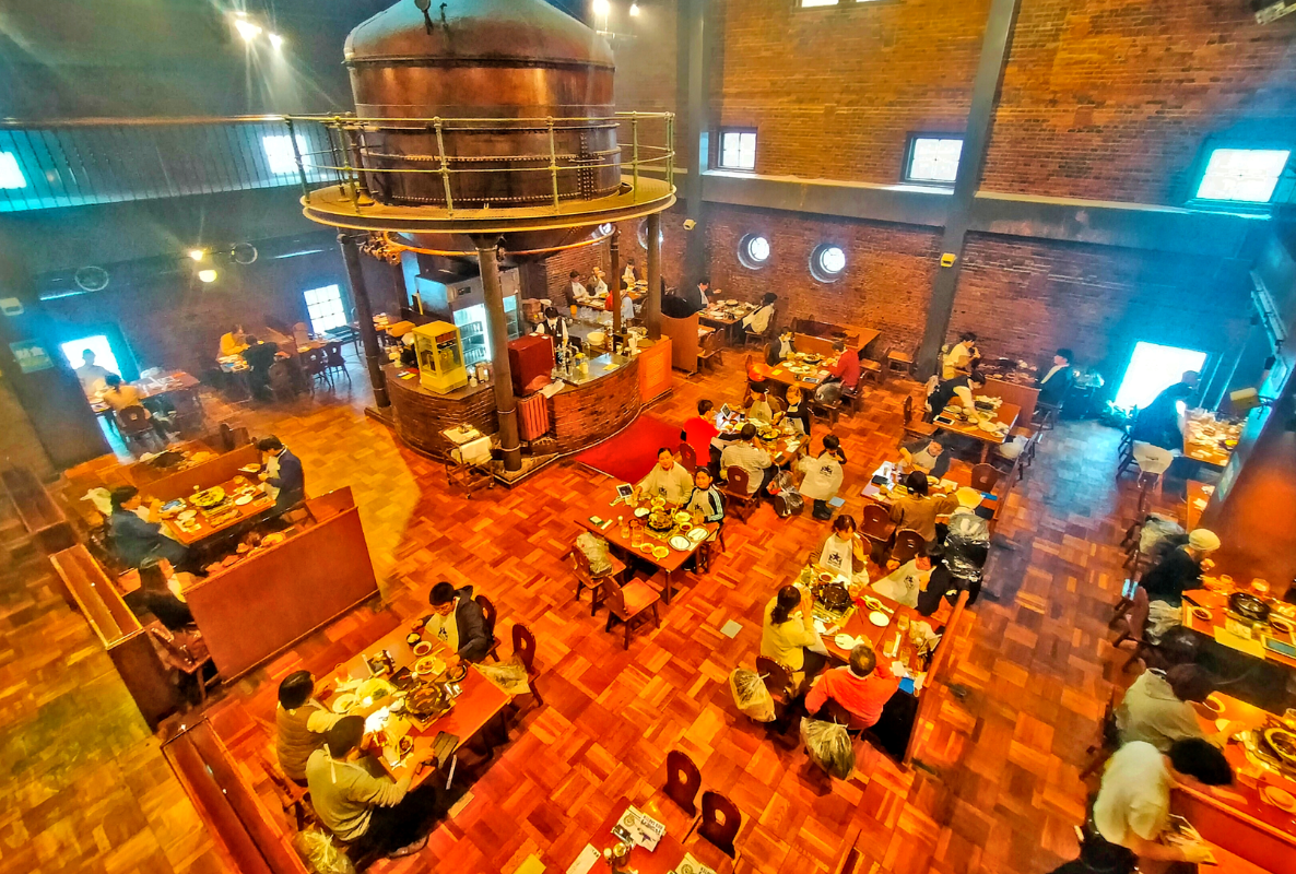 Relax in the iconic beer garden featuring rustic red brick walls where you can savor famous local dishes like Genghis Khan lamb barbecue paired with fresh draft beers, including limited editions available only here.