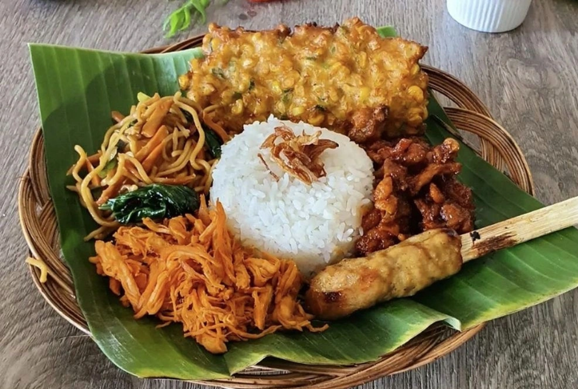 A colorful plate of steamed rice surrounded by an assortment of small side dishes, such as spiced meats, vegetables, sambal, and sometimes eggs or tofu. This dish showcases the harmonious blend of flavors and textures that define Balinese home cooking.