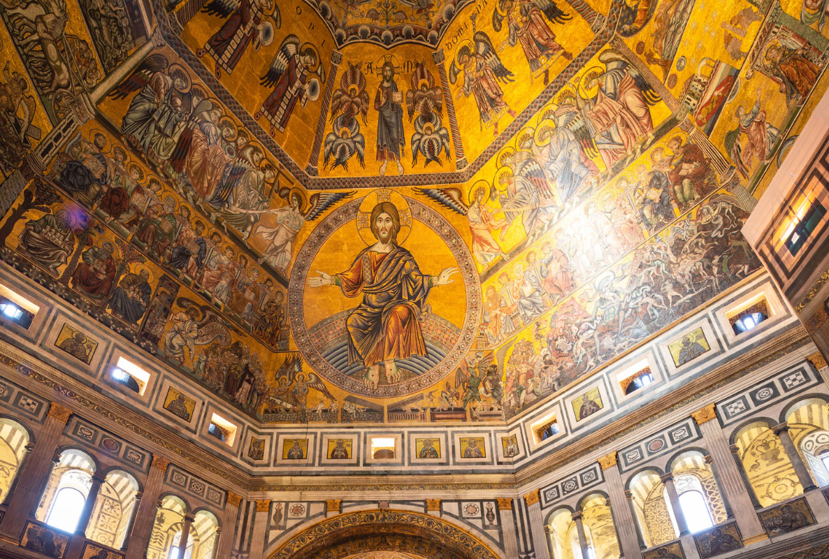 One of Florence's oldest buildings features stunning Byzantine mosaics covering the octagonal ceiling and Ghiberti's famous "Gates of Paradise" bronze doors (now displayed in the museum).â