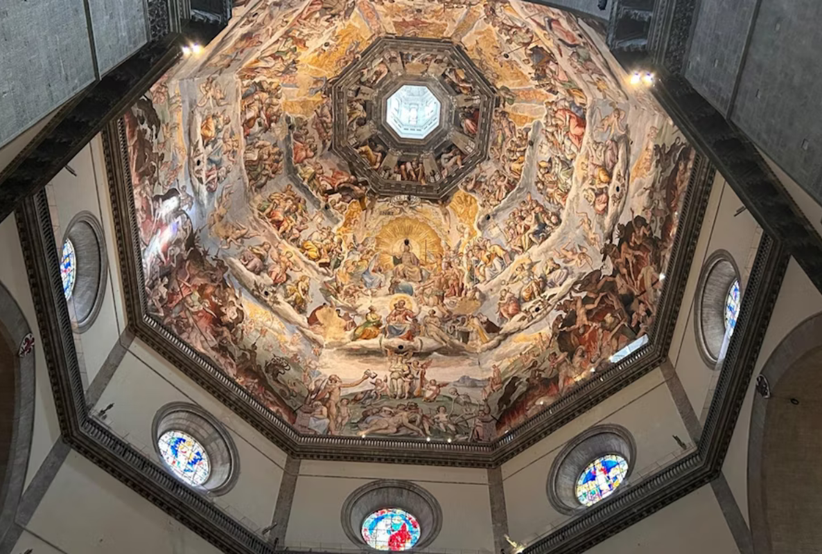 Ascend 463 steps through narrow, spiraling staircases to reach the top of the iconic dome. Midway, walk along the interior balcony for breathtaking close-up views of Vasari's dramatic "Last Judgement" frescoes covering the dome's interior. At the summit, panoramic views of Florence's terracotta rooftops, the Arno River, and rolling Tuscan hills await - an unforgettable reward for the climb.â