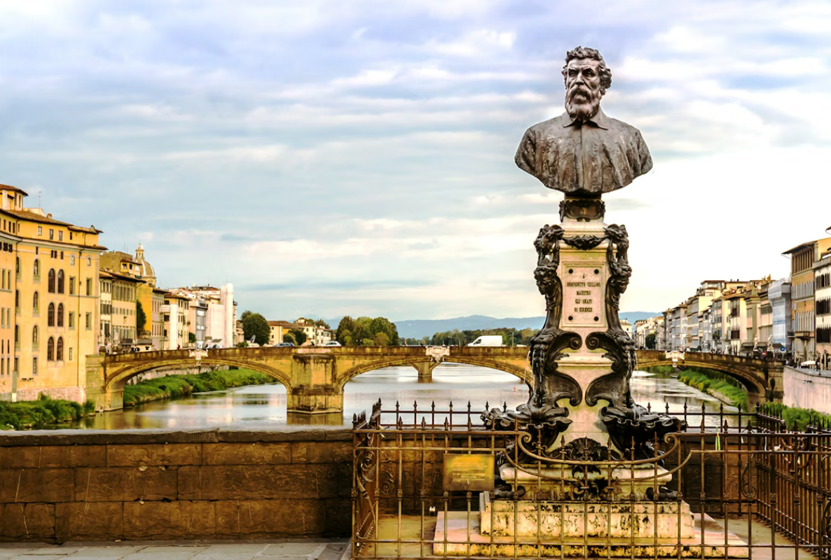 The bronze bust at the bridge's center honors Benvenuto Cellini, a legendary 16th-century goldsmith and sculptor whose artistry represents Florence's rich tradition of metalworking craftsmanship. This monument celebrates the centuries-old goldsmith heritage that continues to define Ponte Vecchio's identity.