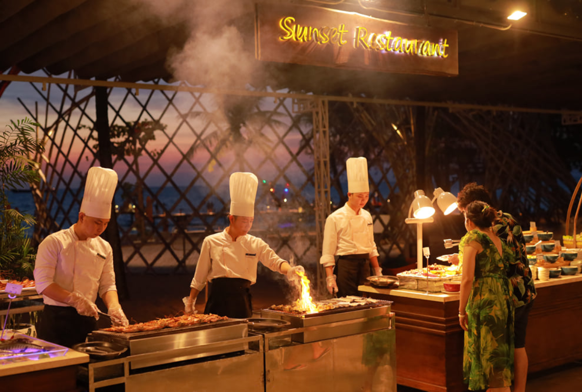 Sunset Restaurant serves a breakfast buffet and à la carte dishes for lunch and dinner. With a sea view and natural light blending with the sound of the waves, the restaurant aims to provide customers with a relaxing and comfortable experience. Sunset Restaurant has a capacity of up to 1,000 guests and can serve buffet parties, anniversaries, barbecue parties, and dinner parties. The restaurant also organizes a seafood BBQ buffet (guests can purchase tickets) for tourists to enjoy the freshest dishes prepared from carefully selected ingredients.