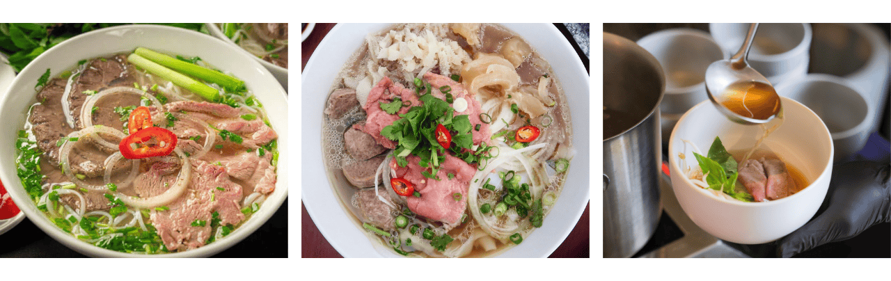 A steaming bowl of phở at one of Saigon's most famous and long-standing noodle shops. Visitors are able to see the restaurant makes Pho noodles inside the opened kitchen.