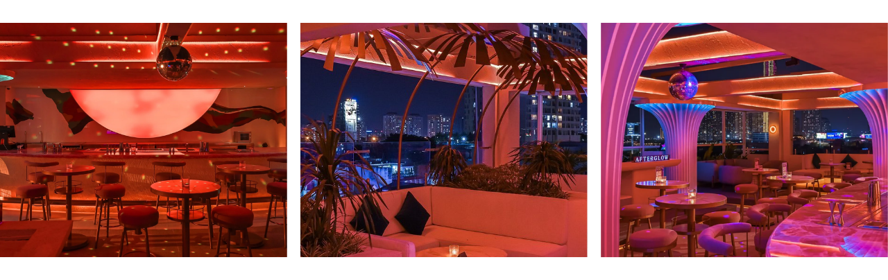 A rooftop lounge bathed in mysterious purple-red lights, offering panoramic city views and a perfect sightline to Landmark 81.