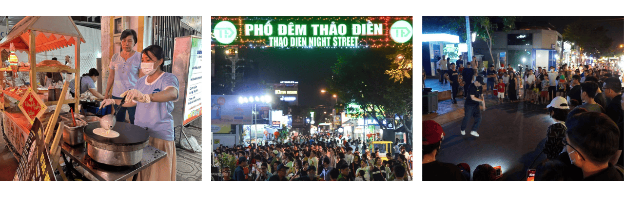 A lively night street along Xuan Thuy, lined with street food carts serving Vietnamese snacks and outdoor seating for visitors to enjoy the vibrant evening scene.