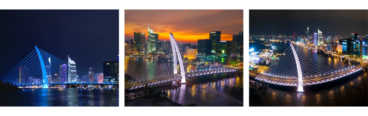 Enjoy sweeping river views and the sparkling city lights from this modern bridge, a perfect spot to experience Saigon’s sunset magic.