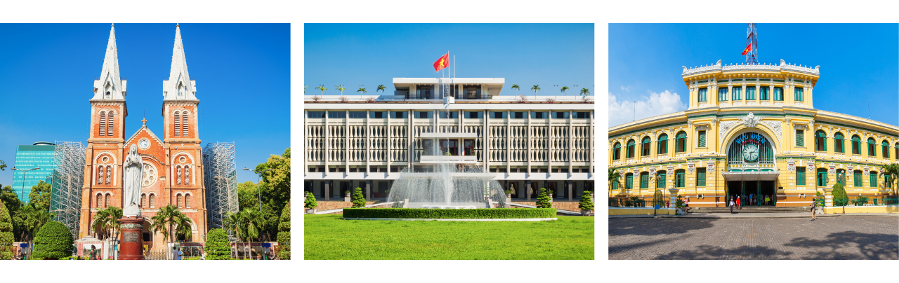 Stroll past the French colonial architecture of Notre Dame Cathedral, the Central Post Office, and the Reunification Palace — timeless icons of Saigon’s history.