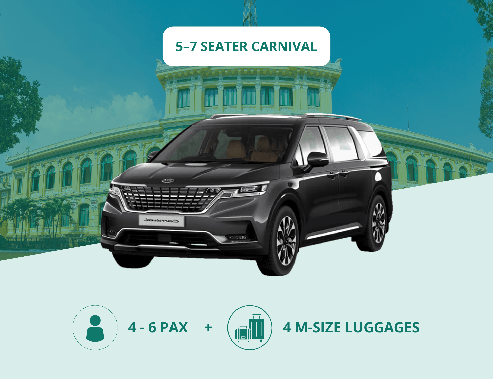 Carnivals can comfortably accommodate 4 - 6 passengers with 4 standard luggage. Please check the car details when booking to make sure it suits your group size and luggage needs.