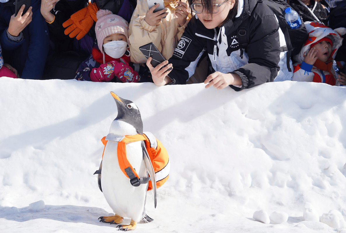 Led by Harbin Polar Park’s original tourism mascot Taoxue Penguin and the Heilongjiang Ice and Snow Angel, adorable Antarctic penguins march together in a charming parade.