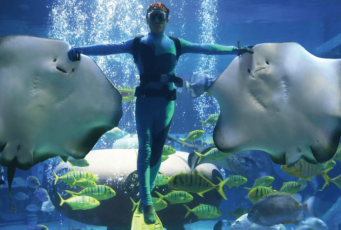 Witness a unique performance featuring graceful cartilaginous fish.