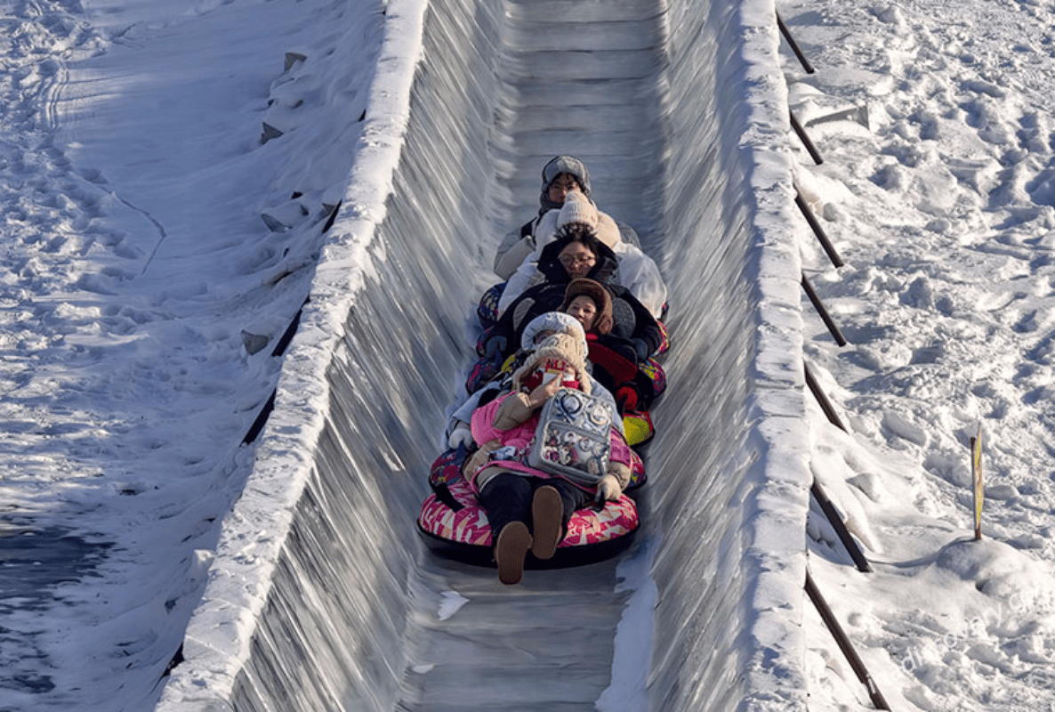 Snow tubing is a fun winter activity where visitors slide down snowy lanes on inflatable tubes without needing any skiing skills.