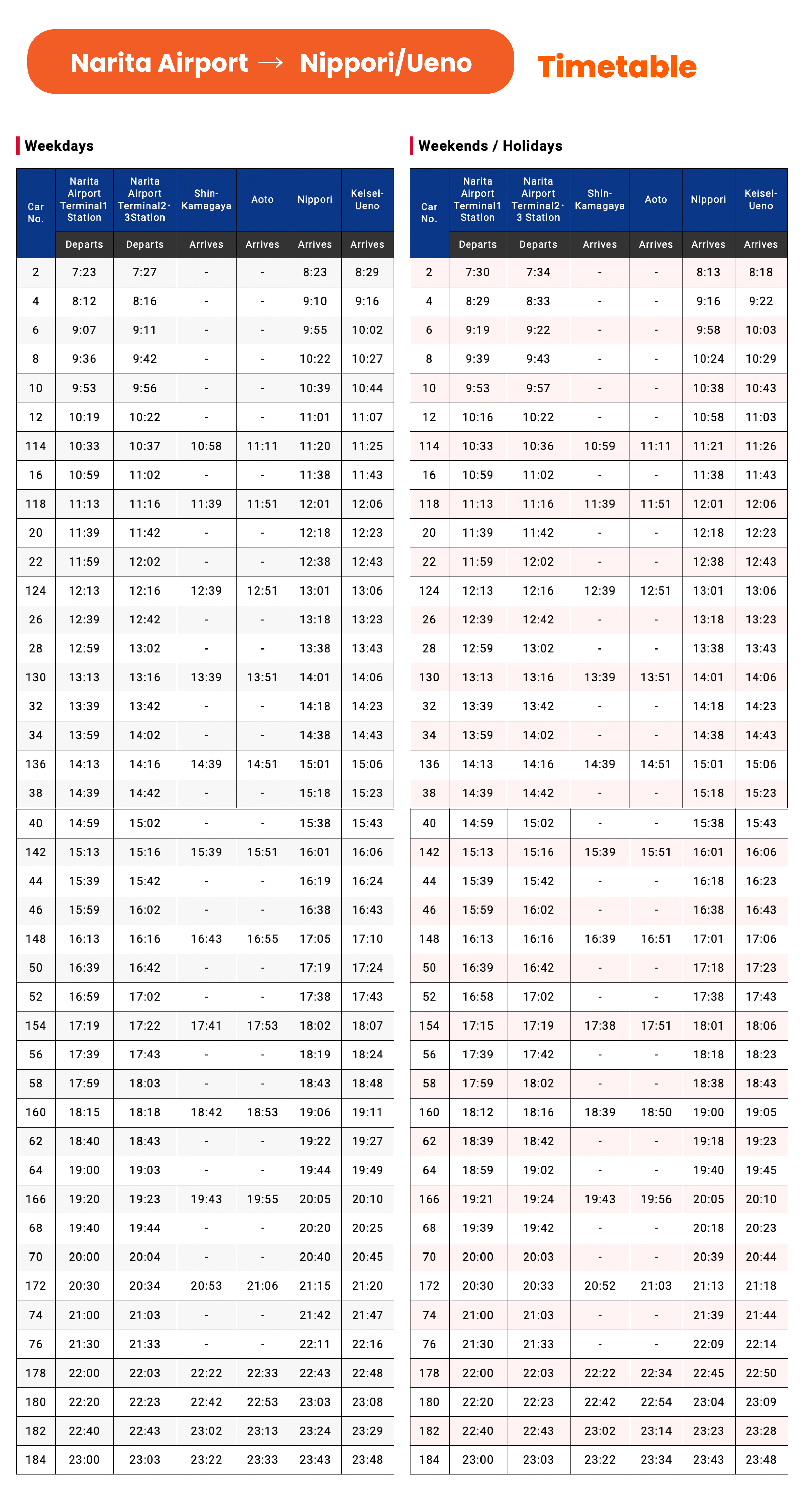 Ueno/Nippori departure: 05:40~20:20 daily (Timetable)