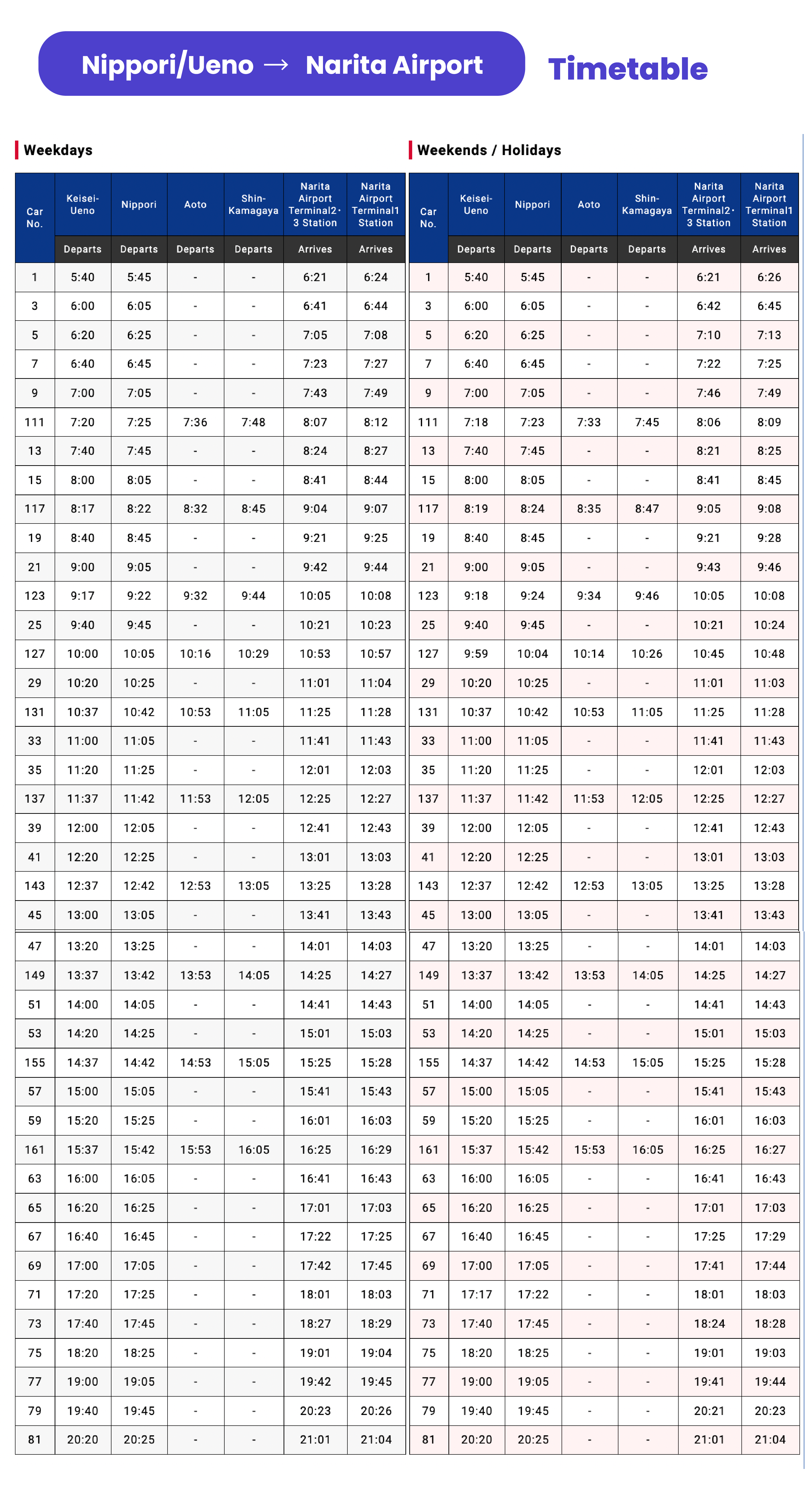 Narita Airport departure: 07:23~23:00 daily (Timetable)