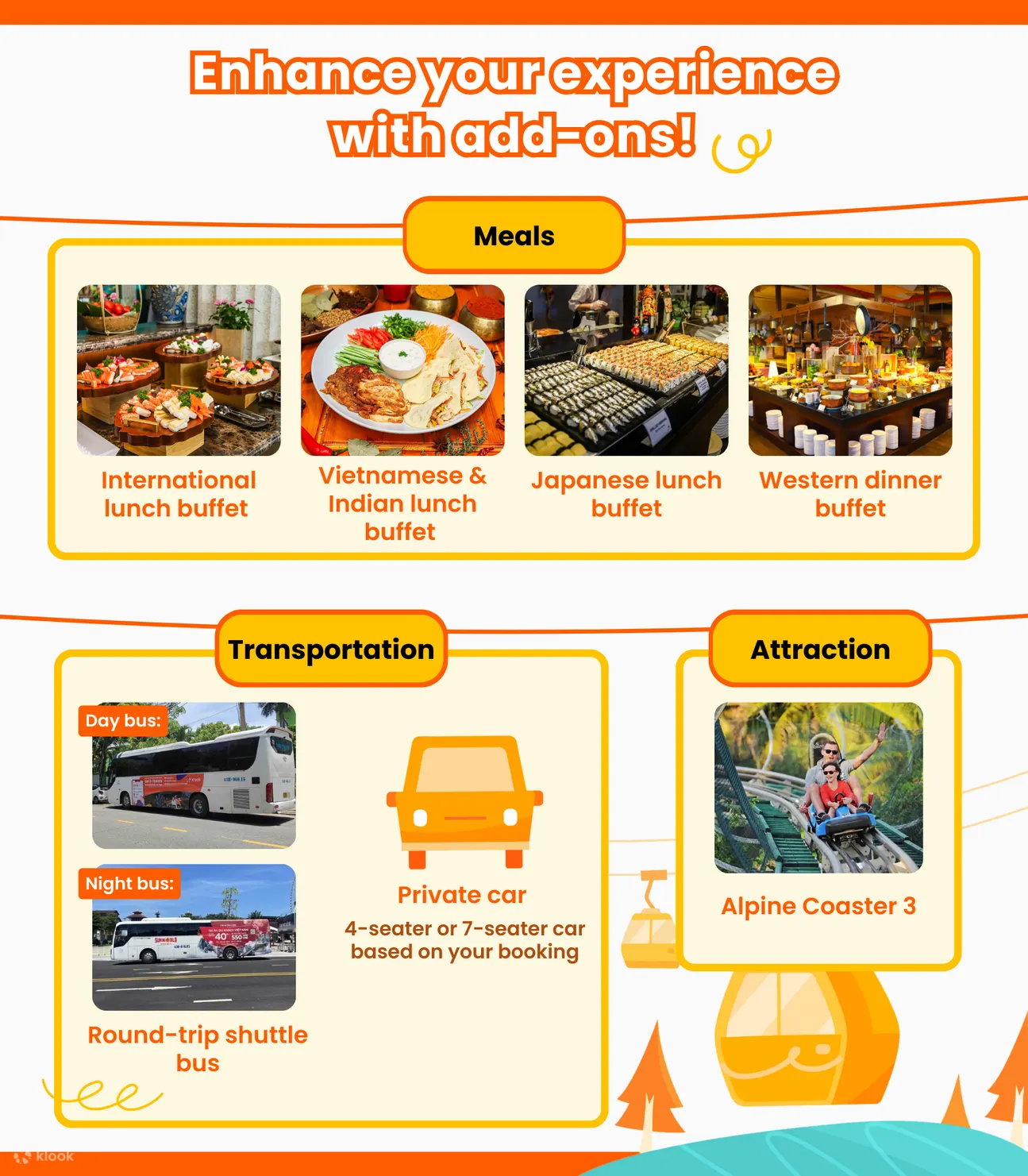 Experience the excitement of Alpine Coaster 3 as it twists through forested slopes, offering a thrilling ride with stunning mountain views. Refuel with a diverse buffet spread, featuring both international and Halal-friendly selections. Travel to and from Ba Na Hills with ease by hopping on the convenient round-trip shuttle bus, or opt for a more private and comfortable journey with a dedicated car service from Da Nang.