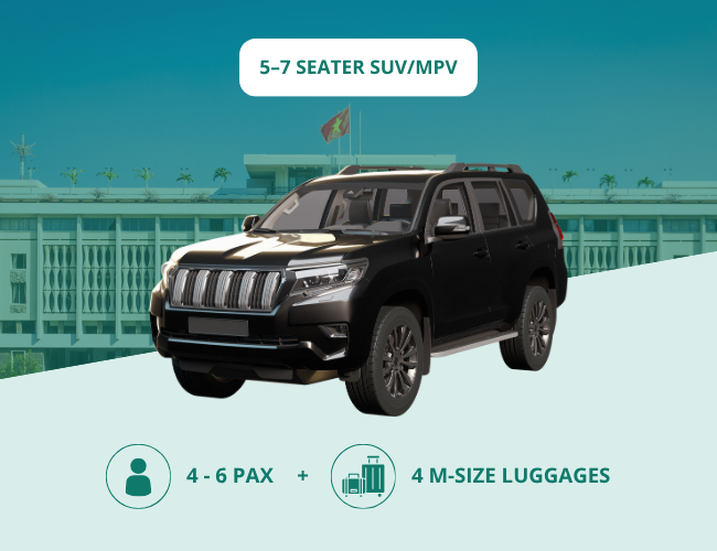 It depends on the vehicle type you choose. SUVs and MPVs like Kia Carnival can comfortably fit 4–6 passengers with standard luggage, while Sedans fit up to 3 passengers. Please check the car option details when booking to make sure it suits your group size.