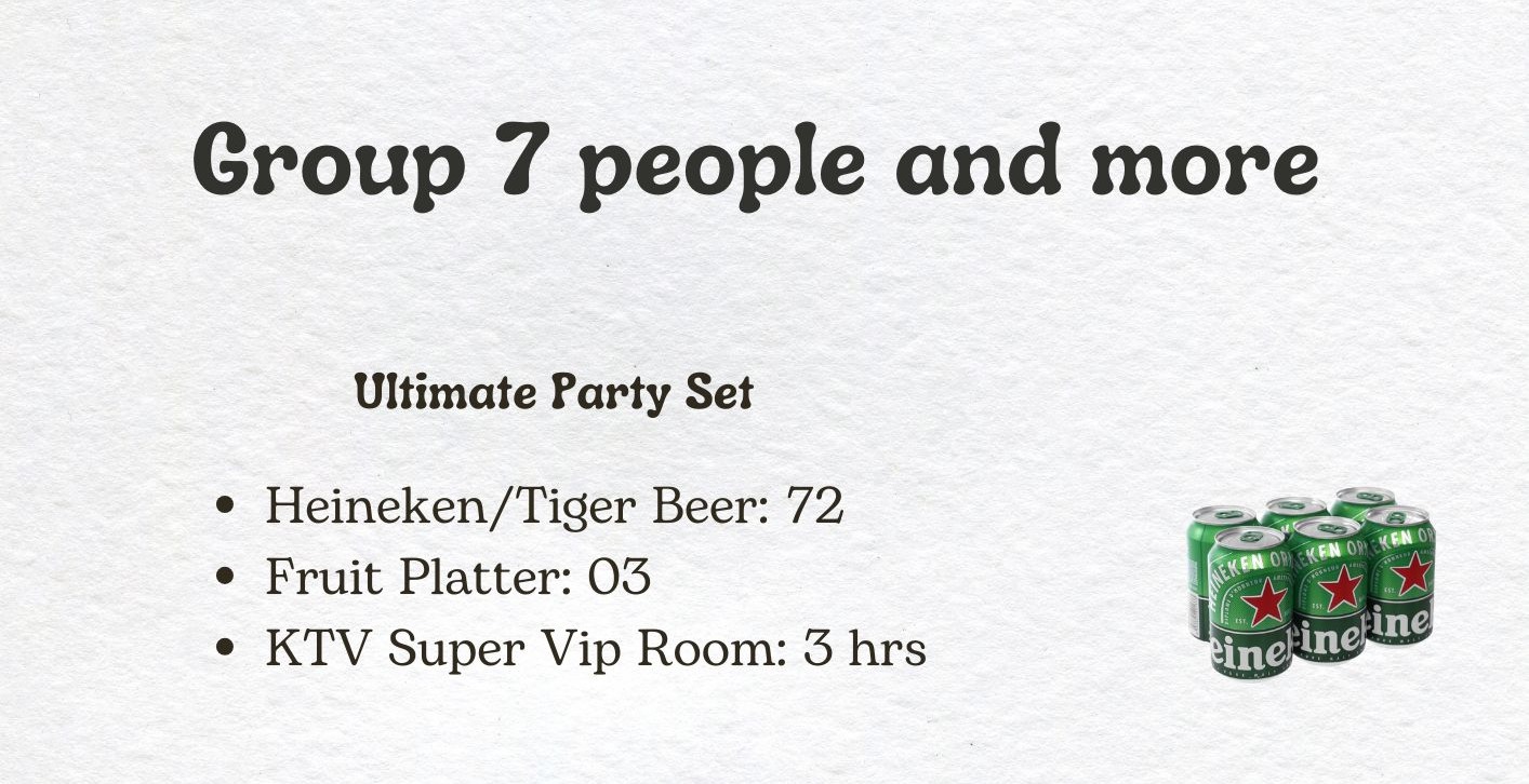 Dù nhóm của bạn lớn hay nhỏ, Galaxy KTV cam kết mang đến trải nghiệm khó quên với dịch vụ xuất sắc, đồ uống chọn lọc và không gian tạo nên kỷ niệm.